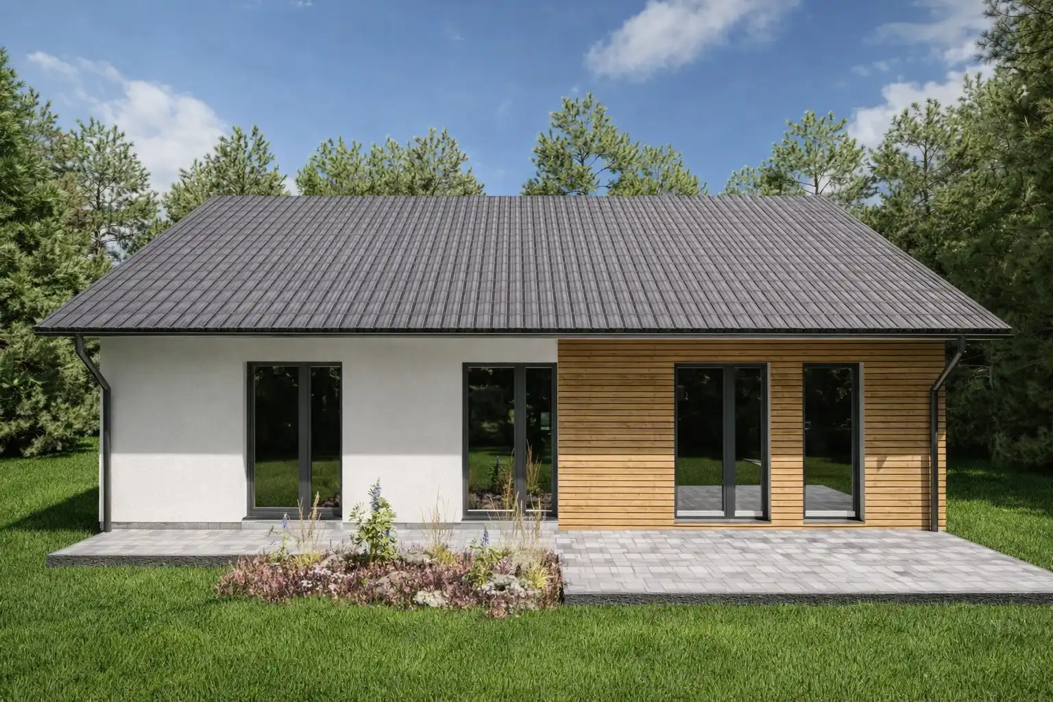Rodinný dom Adriana 150 je ideálne riešenie pre 4 až 5 člennú rodinu. Po vstupe do objektu máme po pravici hosťovskú izbu, po ľavici zasa menšiu kúpeľňu, kumbál pod schodami a samotné schodisko. Prejdeme cez dvere pred nami, ktoré nás dostanú do dennej zóny v ktorej sa nachádza priestranná obývacia izba, spojená s jedálňou a kuchyňou v tvare ,,U´´ s kuchynským ostrovčekom. Keď sa vrátime späť do chodby a stúpame po točitých schodoch v tvare ,,U´´ dostaneme sa na chodbu nočnej zóny, ktorá disponuje vstupmi do troch detských izieb, spálne pre rodičov, v ktorej sa nachádza aj šatníková miestnosť a kúpeľnou. Dom disponuje našou vlastnou sedlovou strechou, ktorá je plne pochôdzna a tým pádom obrovským úložným priestorom v rozlohe jedneho celého podlažia domu. Projekt domu je dostupný aj v zrkadlovom prevedení, v ktorom sú možné väčšie či menšie úpravy.