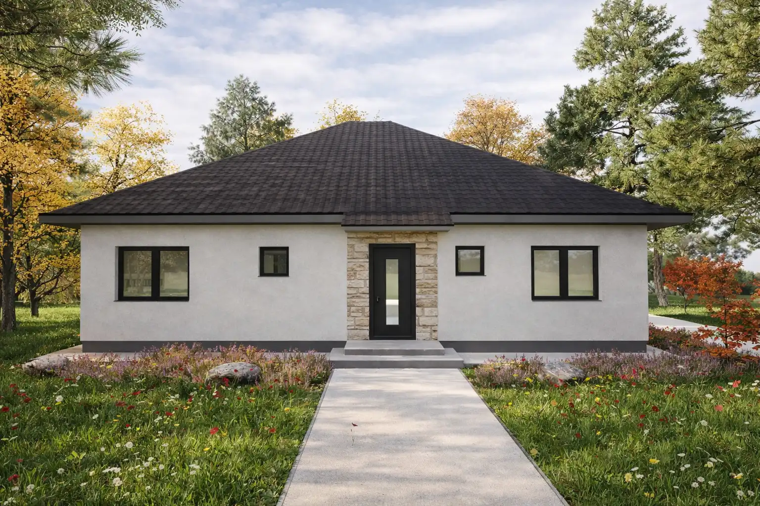 Rodinný dom Adriana 150 je ideálne riešenie pre 4 až 5 člennú rodinu. Po vstupe do objektu máme po pravici hosťovskú izbu, po ľavici zasa menšiu kúpeľňu, kumbál pod schodami a samotné schodisko. Prejdeme cez dvere pred nami, ktoré nás dostanú do dennej zóny v ktorej sa nachádza priestranná obývacia izba, spojená s jedálňou a kuchyňou v tvare ,,U´´ s kuchynským ostrovčekom. Keď sa vrátime späť do chodby a stúpame po točitých schodoch v tvare ,,U´´ dostaneme sa na chodbu nočnej zóny, ktorá disponuje vstupmi do troch detských izieb, spálne pre rodičov, v ktorej sa nachádza aj šatníková miestnosť a kúpeľnou. Dom disponuje našou vlastnou sedlovou strechou, ktorá je plne pochôdzna a tým pádom obrovským úložným priestorom v rozlohe jedneho celého podlažia domu. Projekt domu je dostupný aj v zrkadlovom prevedení, v ktorom sú možné väčšie či menšie úpravy.