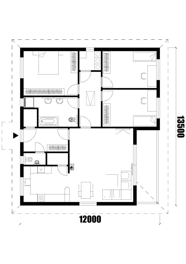 Rodinný dom Lenka 128 je ideálne riešenie pre 3 až 4 člennú rodinu. Vstupujeme do malej predsiene, ktorá disponuje samostatným záchodom pre hostí a malým kumbálom po ľavej strane. Z chodby priamo vstupujeme do dennej zóny domu v ktorej sa nachádza otvorená kuchyňa so špajzou, jedáleň a obývacia izba s prefabrikovaným krbom. Z dennej zóny sa presunieme do nočnej, ktorá disponuje dvomi izbami, spálňou, technickou miestnosťou a priestrannou kúpeľňou. V dome sa nachádza povalový výlez pre vstup na plne pochôdznu povalu v rozlohe celého domu. Rodinný dom disponuje našou vlastnou valbovou strechou. Projekt domu je dostupný aj v zrkadlovom prevedení, v ktorom sú možné väčšie aj menšie úpravy.