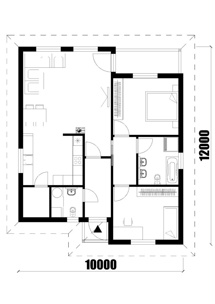 Rodinný dom Lenka 89 je ideálne riešenie pre 2 až 3 člennú rodinu. Vstupujeme do malej predsiene, ktorá disponuje samostatným záchodom pre hostí po ľavej strane. Z chodby priamo vstupujeme do dennej zóny domu v ktorej sa nachádza otvorená kuchyňa so špajzou, jedáleň a obývacia izba s prefabrikovaným krbom. Z dennej zóny sa presunieme do nočnej, ktorá disponuje jednou izbou, spálňou a kúpeľňou. V dome sa nachádza povalový výlez pre vstup na plne pochôdznu povalu v rozlohe celého domu. Rodinný dom disponuje našou vlastnou valbovou strechou. Projekt domu je dostupný aj v zrkadlovom prevedení, v ktorom sú možné väčšie aj menšie úpravy.