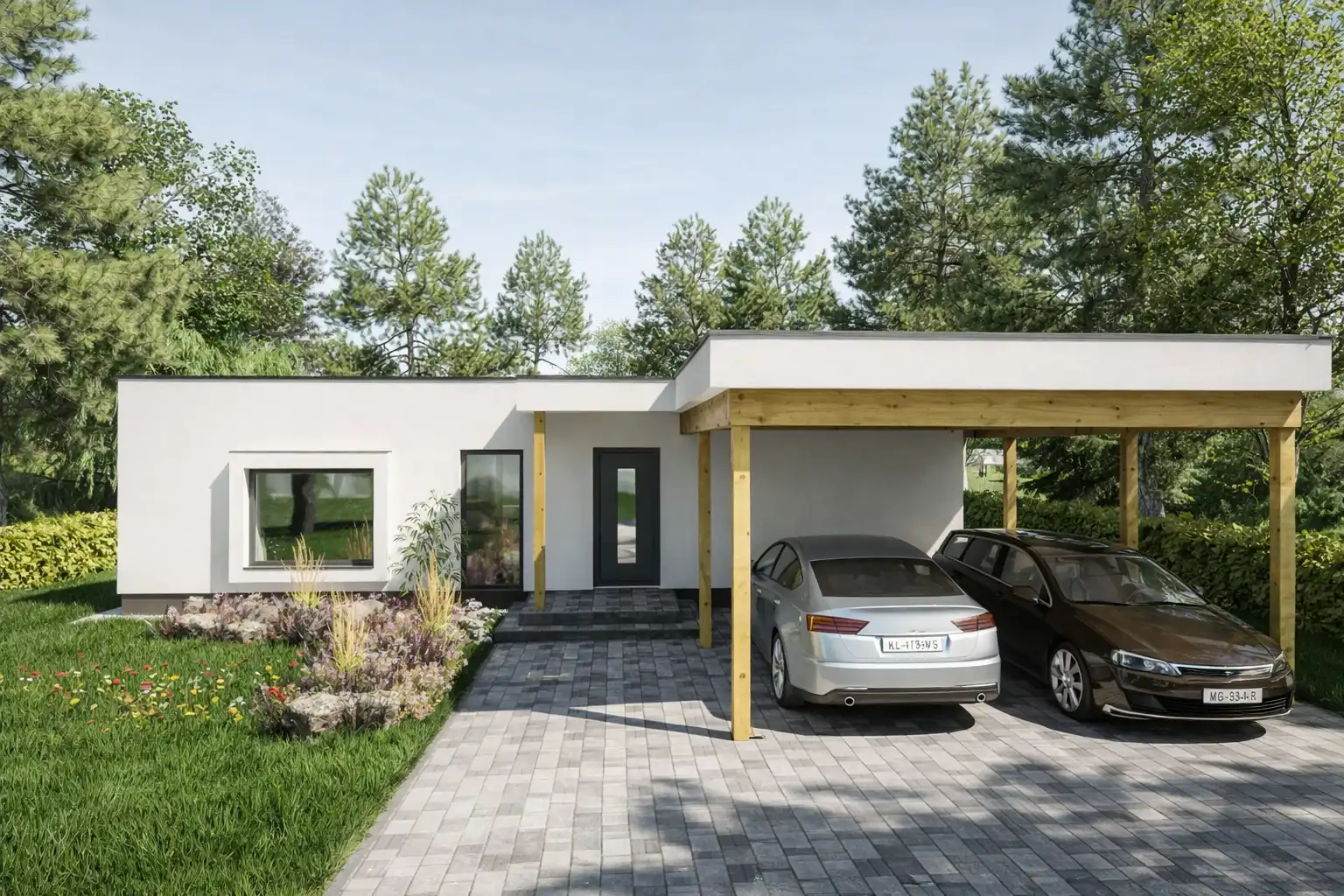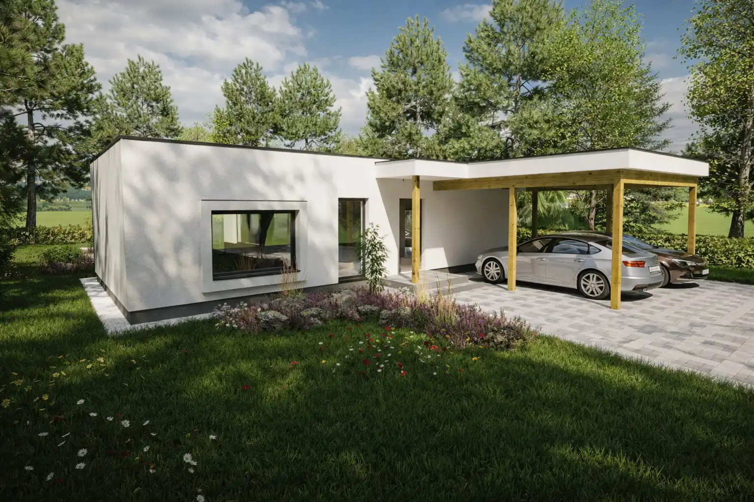 Rodinný dom Adriana 150 je ideálne riešenie pre 4 až 5 člennú rodinu. Po vstupe do objektu máme po pravici hosťovskú izbu, po ľavici zasa menšiu kúpeľňu, kumbál pod schodami a samotné schodisko. Prejdeme cez dvere pred nami, ktoré nás dostanú do dennej zóny v ktorej sa nachádza priestranná obývacia izba, spojená s jedálňou a kuchyňou v tvare ,,U´´ s kuchynským ostrovčekom. Keď sa vrátime späť do chodby a stúpame po točitých schodoch v tvare ,,U´´ dostaneme sa na chodbu nočnej zóny, ktorá disponuje vstupmi do troch detských izieb, spálne pre rodičov, v ktorej sa nachádza aj šatníková miestnosť a kúpeľnou. Dom disponuje našou vlastnou sedlovou strechou, ktorá je plne pochôdzna a tým pádom obrovským úložným priestorom v rozlohe jedneho celého podlažia domu. Projekt domu je dostupný aj v zrkadlovom prevedení, v ktorom sú možné väčšie či menšie úpravy.
